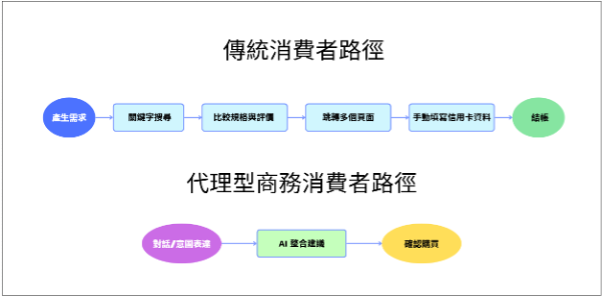 所謂「代理型商務」,是指由 AI 代理人(AI Agents)代表人類消費者處理商務活動的模式。它超越了傳統的搜尋引擎或演算法推薦,具備了更強的主動性與整合能力。 在傳統電商模式下,消費者的路徑較長;在代理型商務的場景中,路徑可被簡化。以下為兩種路徑的對比圖: