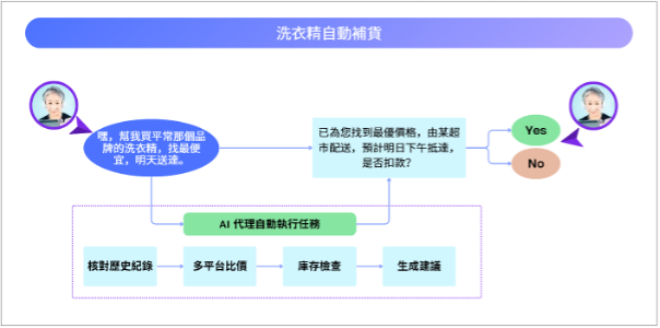 想像一下,你正在廚房忙碌,突然發現洗衣精快用完了。你不需要放下手邊的工作去打開購物 App,只需對著家中的智慧終端或手機說:「嘿,幫我買平常那個品牌的洗衣精,找最便宜,明天送達。」
