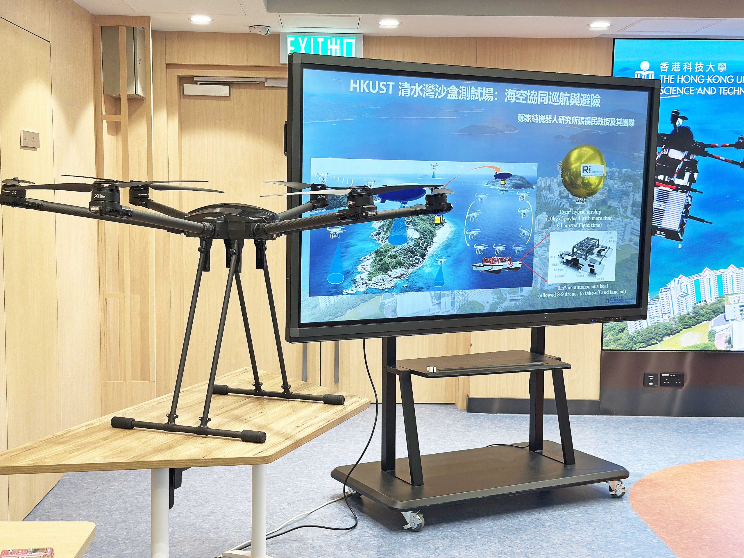 無人機由科大校園,飛到西貢萬宜水庫,全程僅需10分鐘。科大已提交「監管沙盒」試點計劃申請,打算在清水灣一帶設立試飛場,例如研究協助緊急救援工作。發布會昨即場示範,有求助者透過手機報案,無人機再按照SMS發送的連結,透過長距離廣域網絡LoRaWAN,緊急傳送醫療必需品,例如自動心臟除顫器(AED機)、強心針等;監控介面設地圖追蹤功能,顯示無人機預計抵達時間,抵埗後拍攝現場畫面。