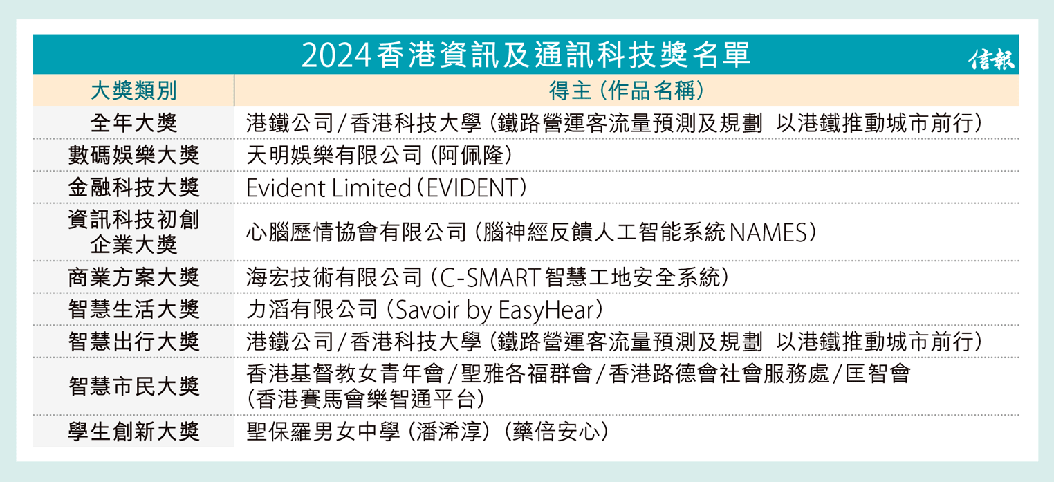 本地業界年度旗艦盛事「2024香港資訊及通訊科技獎」(HKICT Awards 2024),頒獎禮已於上周五(22日)結束。財政司司長陳茂波向港鐵(00066)及香港科技大學頒發全年大獎,勝出隊伍憑「鐵路營運客流量預測及規劃 以港鐵推動城市前行」勇奪最高殊榮。