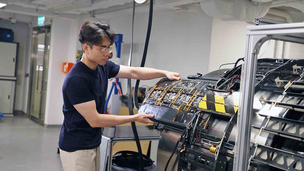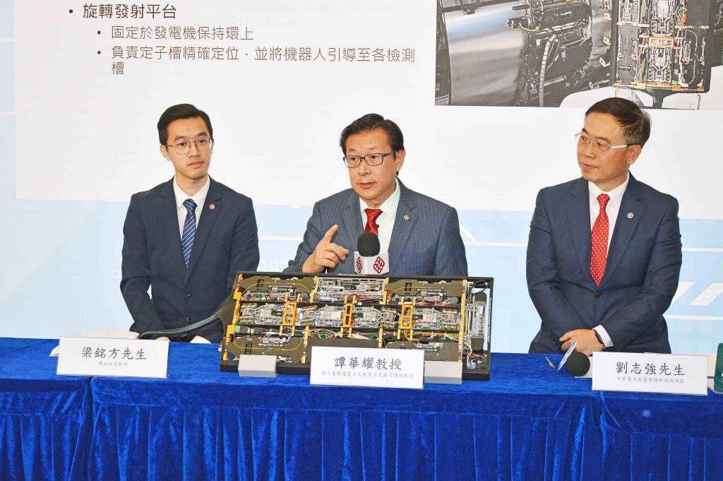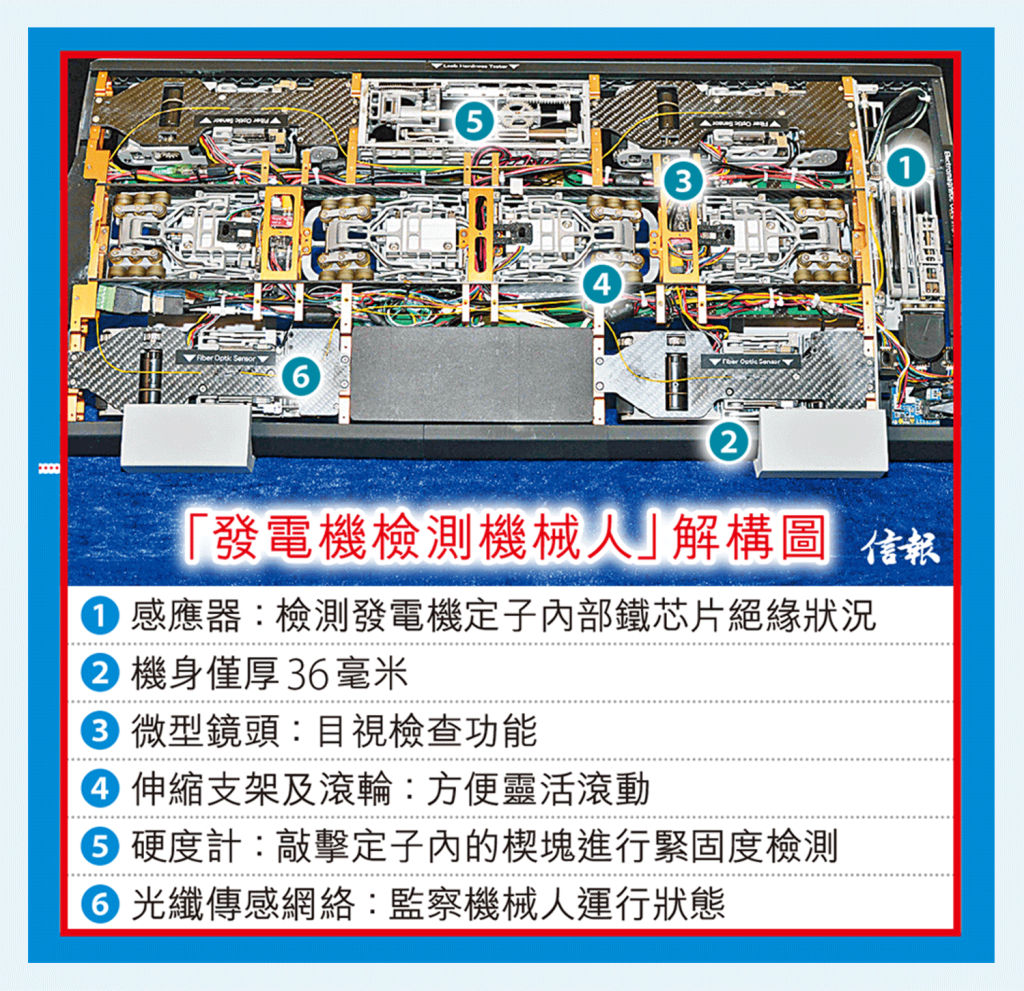 理大電機及電子工程學系研究助理梁銘方介紹,發電機檢測機械人採用超薄設計,可靈活進出僅45毫米闊的氣隙,跨越氣隙內的通風擋板。在毋須拆卸轉子下,自動完成主要檢測工序。除了以感應器掃描及偵測潛在問題,機身又配備高解析視覺系統,能夠目視檢查通風管道,更可以拿着「小鎚仔」,檢測定子內部鐵芯片絕緣狀況,以及敲擊定子內的楔塊檢測緊度。機械人又內置光纖傳感網絡,以檢查其運行狀態。