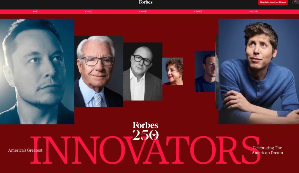 《福布斯》指出,這250位創新者橫跨科技、金融、影視等界別,不但體現發明家愛迪生(Thomas Edison)的創新精神,更能將突破性技術推向市場、繼而改變,甚至成為開創產業的商業領袖。馬斯克登上榜首,在於「從零到一」創立或培育多間企業,包括電動車廠商特斯拉(Tesla)、太空探索企業SpaceX、腦機晶片公司Neuralink、AI科企xAI,還有隧道工程公司The Boring Company。