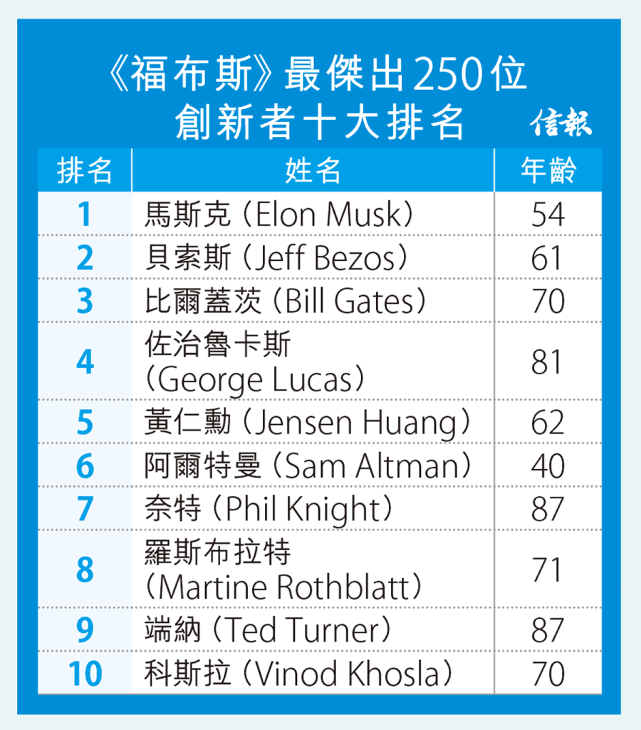 財經雜誌《福布斯》(Forbes)為慶祝美國建國250周年,公布最傑出250位創新者榜單。名單從近千名候選人選出,評分準則包括創意、廣度、參與度、顛覆性及商業影響力,除了經過人類評審團評比,更將結果輸入人工智能(AI)系統,讓ChatGPT及Gemini兩款AI工具計算排名。現年54歲的全球首富馬斯克(Elon Musk),憑着跨產業的頂尖企業成就,登上創新者榜首。