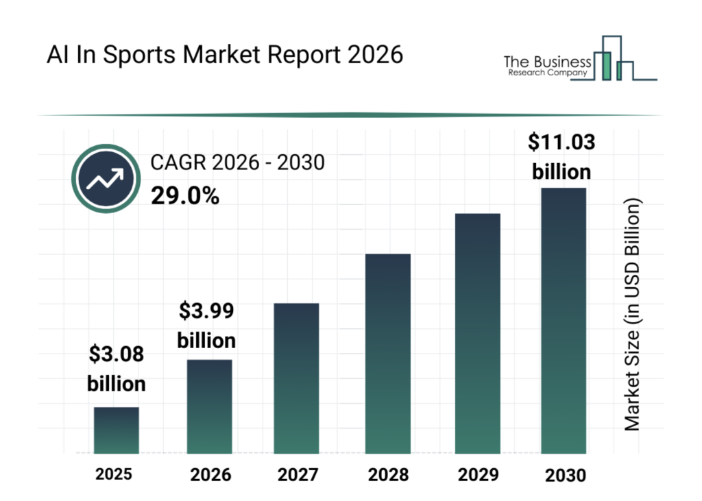 在這樣的背景下,人工智能的快速普及,正為運動科學發展帶來新的動能。若從市場規模觀察,這一趨勢已十分明顯。根據市場研究機構 The Business Research Company 於今年三月發表的報告,全球 AI in Sports Market 預計將由 2025 年的 30.8 億美元增長至 2026 年的 39.9 億美元,年均複合增長率達 29.4%。帶動增長的主要因素,包括職業運動聯盟持續擴張、視頻分析技術普及、運動員表現優化投資增加、體育轉播收入提升,以及可穿戴設備的廣泛應用。