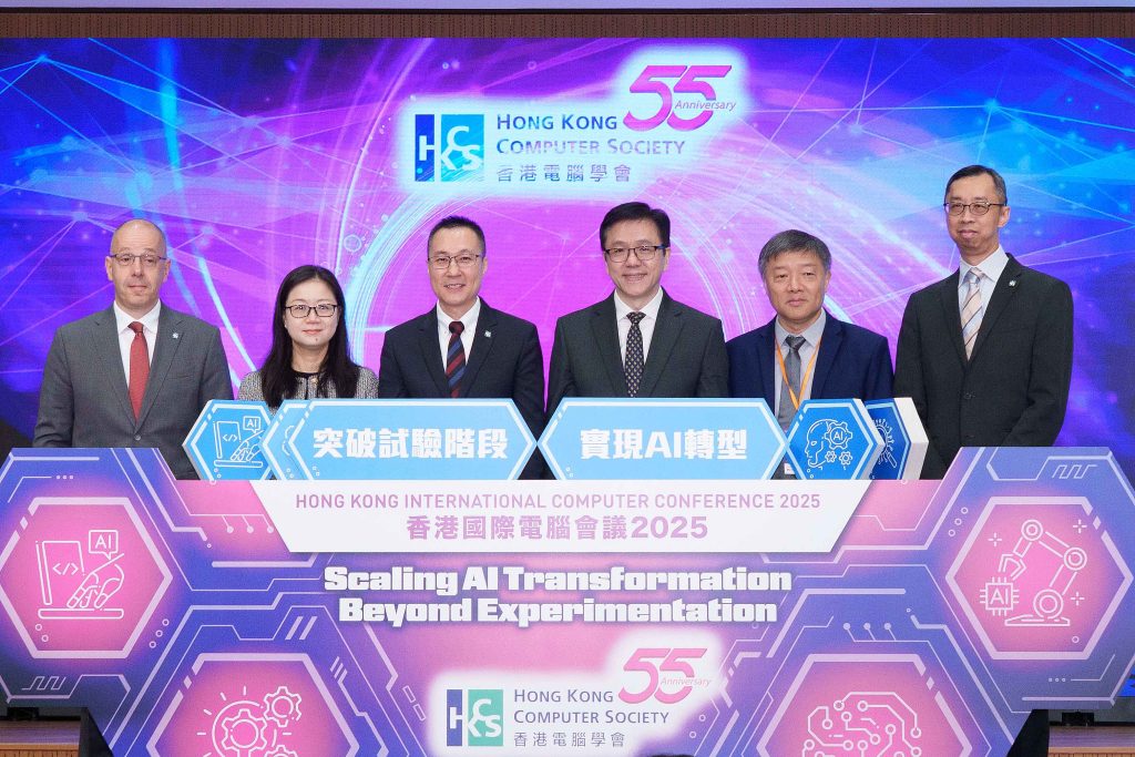 HKCS昨召開「香港國際電腦會議」,創新科技及工業局局長孫東(右三)出席啟幕儀式,左三為陳俊偉。(香港電腦學會提供圖片)