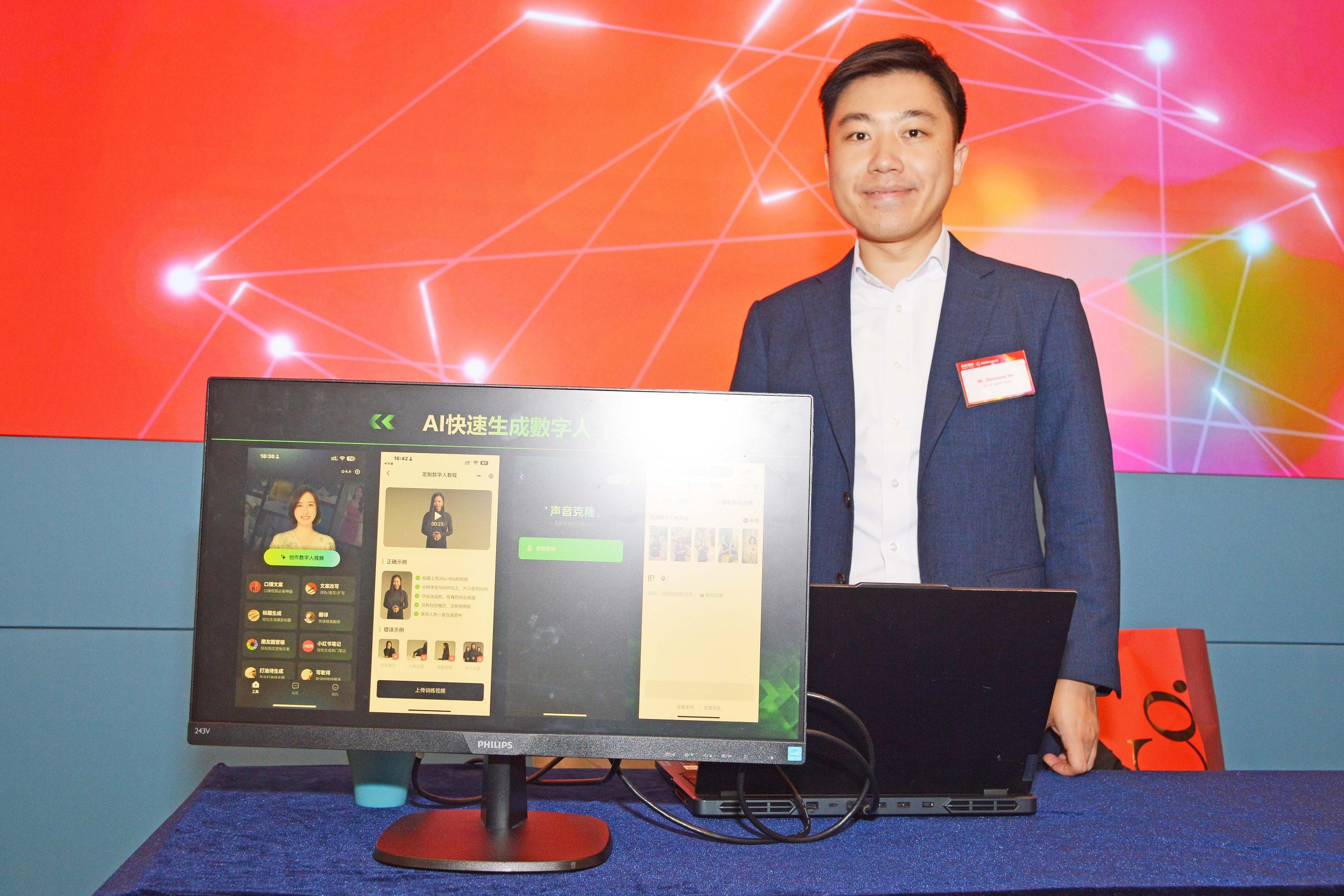 理光昨在發布會連同夥伴企業,介紹合作研發的AI智能代理案例。Alpha AI Technology Limited聯合創辦人及行政總裁何進一受訪時稱,公司主要建立KOS(Key Opinion Sales),複製員工的聲音及臉孔後,以提供數字人市場營銷,適用於地產、保險、餐飲及銀行業。他透露,每條影片製作成本由數百元至幾千元不等,其背景亦可以轉變,支援兩文三語等語言。