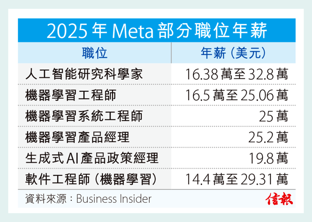 Meta在2025年提交超過5800份H-1B高技術工作簽證及其他工作簽證申請,新聞網站Business Insider分析數據後發現,Meta的AI副總裁基本年薪高達65萬美元(約507萬港元)。