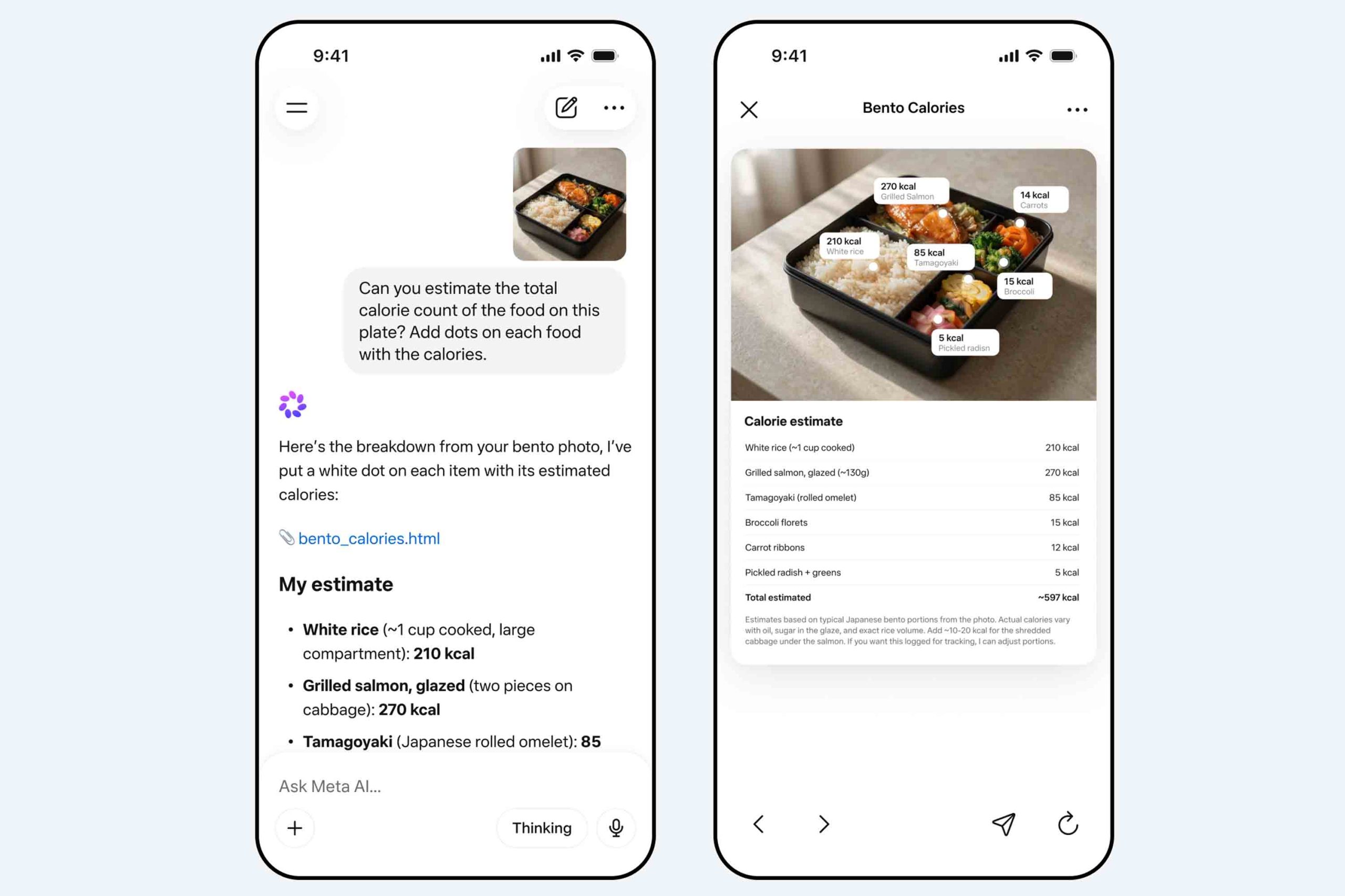 作為一款原生多模態推理模型,Muse Spark支援工具使用、視覺思考鏈及多代理協作,它可接受語音、文字和影像輸入,惟發布時僅支援文字輸出。應用場景方面,例如「健康推理」模式,逾千名醫師合作訓練數據,上傳一張日式便當的相片,就能列出各種食材的卡路里含量。