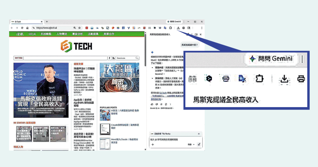 用戶只需點擊分頁右上角的圖示(問問Gemini),即可打開側邊面板,與網頁瀏覽助理對話。全程毋須切換分頁(Tabs),可以總結冗長的網頁內容、執行各項任務(例如為即將到來的考試製作突擊測驗)、解答問題(例如「如何將這份食譜改為純素?」),系統更能記住早前瀏覽過的網頁。