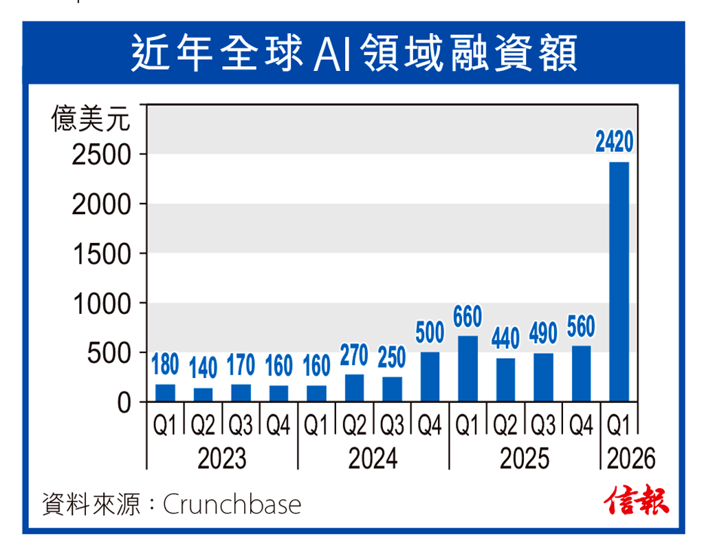 創投資料庫Crunchbase數據顯示,今年首季全球創投市場高度集中,人工智能(AI)領域佔近八成資金,即約2420億美元(約1.88萬億港元),約三分之二由4間美國AI公司拿下。