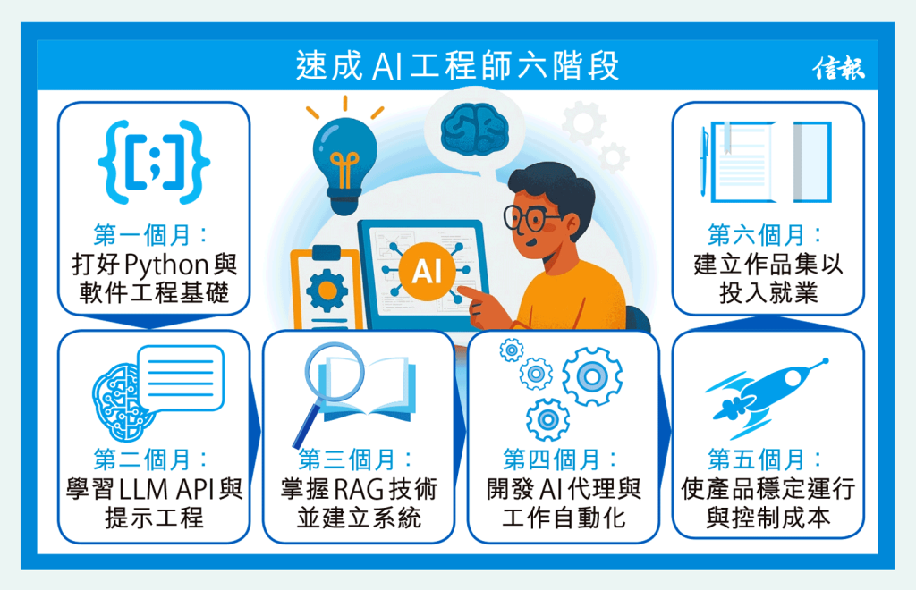 人工智能(AI)工程技能炙手可熱,美國初級AI工程師年薪可達百萬元,吸引不少人入行。有人從機器學習理論入門,亦有人直接跳到研究提示及AI代理,而初學者大多不知如何着手。社交平台X最近流行一篇《如何6個月內成為AI工程師》(How to become an AI Engineer in 6 months)長文,累計突破275萬次瀏覽及超過千次轉發。文章同時附上學習資源,教導讀者如何在6個月內,從零成為獨當一面的工程師。
