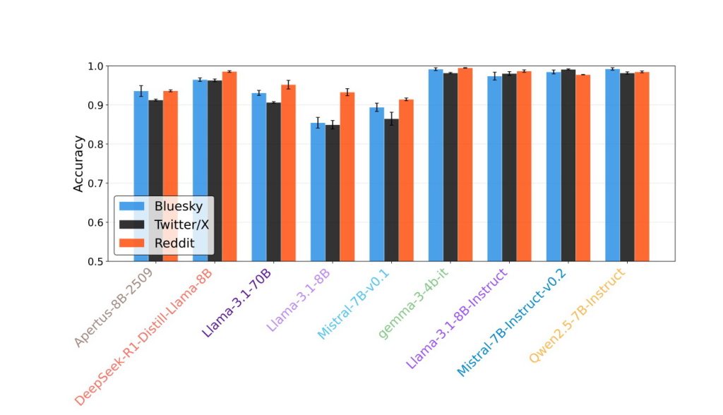 傳統圖靈測試是由人類判斷文字是否出自真人,但這次研究人員收集了社媒X、Bluesky與Reddit三個社交平台的真人對話,再讓AI模型模仿回覆之後,最後由機器學習模型判斷內容是否像由真人寫作。接受測試的有Llama、DeepSeek、Qwen、Mistral等9個不同版本開源模型。結果顯示,判別準確率高達70%到80%,代表AI文字雖然愈來愈自然,但當中仍存在可偵測的痕跡。