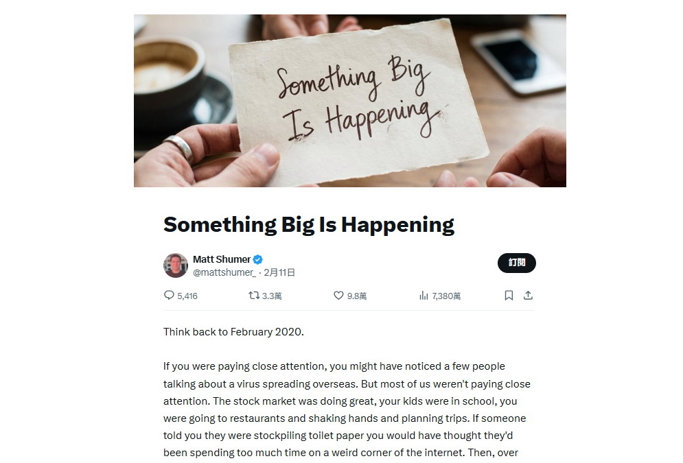 美國人工智能(AI)初創OthersideAI聯合創辦人兼行政總裁舒默(Matt Shumer),近日在社交媒體X發表一篇名叫〈大事即將發生〉(Something Big Is Happening)的長文,隨即爆紅被廣傳,網上曝光度接近7300萬次,並獲多間傳媒廣泛報道。