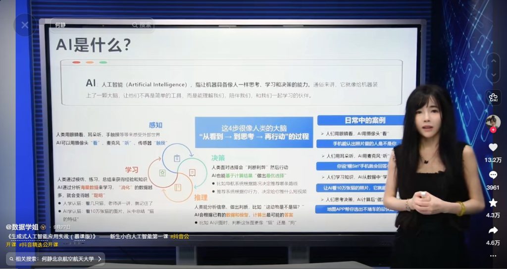 北京航空航天大學(北航)一位年輕的美女副教授何靜,近日在抖音自媒體賬號「數據學姐」上傳教學影片,把生成式人工智能(GenAI)解說得通俗易懂,她隨後在社交媒體爆紅,引發網民對她青春外貌及學歷的熱烈討論。