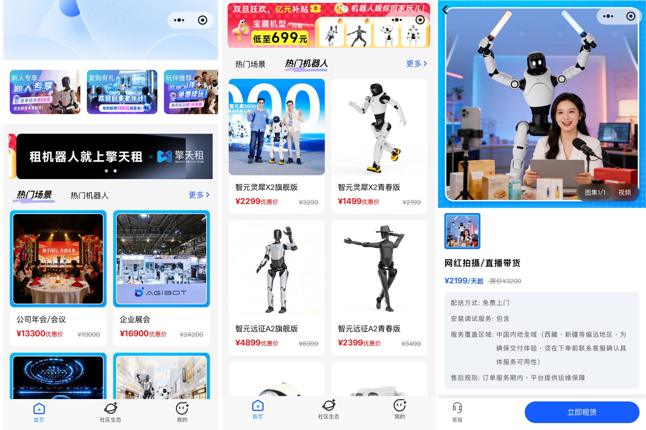 「擎天租」標榜可用微信下單,48小時到貨,本報記者打開微信可見,以公司年會場景為例,每天租金13300元起,機械人功能包括迎賓簽到、拍照打卡、賽博主持、節目展演等;企業展會方面,每天租金16900元起,機械人可提供迎賓接待、講解互動、嘉賓禮贈、書法祝福等服務。用戶亦可選擇生日宴會(每天租金2500元起)、網紅拍攝或直播帶貨(每天租金2199元起)。可供租賃的熱門機械人,包括智元機器人的人形機械人,例如遠征A2、靈犀X2等。同時,設有首形仿生人形機械人F1 Lite及首形精靈.璇。