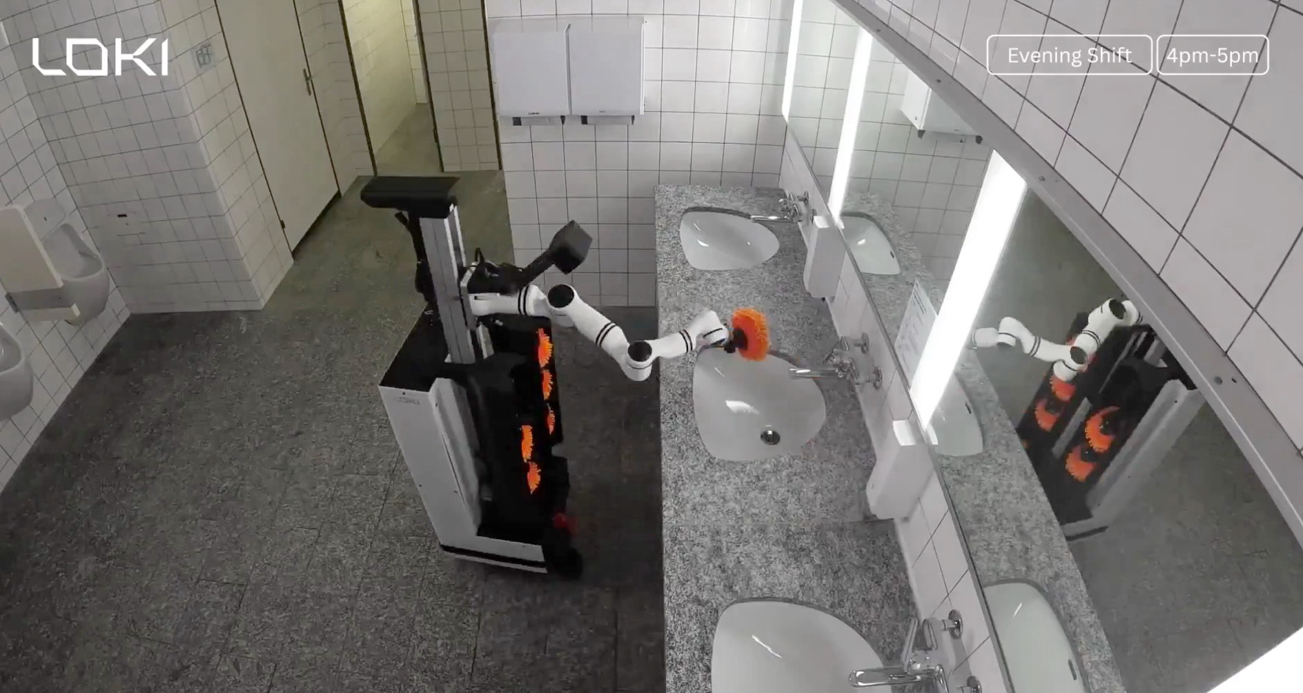 瑞士科企Loki Robotics在社交平台X,介紹其最新研發的洗廁所機械人Loki,它懂得像人一樣清潔,例如更換工具、精準塗抹清潔劑、清洗洗手盆,更可與真實物體互動,例如拾起布袋、翻起廁板、扭掣沖廁、打開梘液盒、執起地板紙碎等。