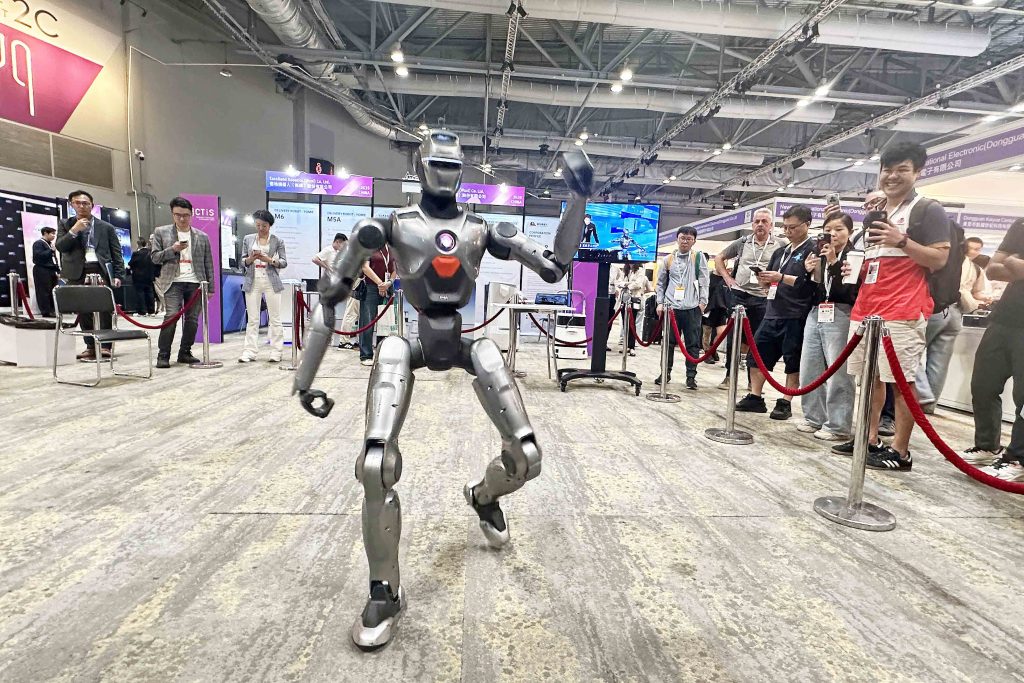 環球資源二期香港展上周六(18日)起一連4日在亞洲國際博覽館舉行。今年首設1200個展位的「AI主題館」,雲集Al智能終端、Al穿戴、Al眼鏡、Al玩具、AI寵物用品、AI個人健康護理及其他AI產品。本年初與美國網紅「甲亢哥」(IShowSpeed)在街頭共跳「斧頭舞」的眾擎機器人PM01設有專區,現場不時大跳勁歌熱舞,吸引海外訪客圍觀打卡。