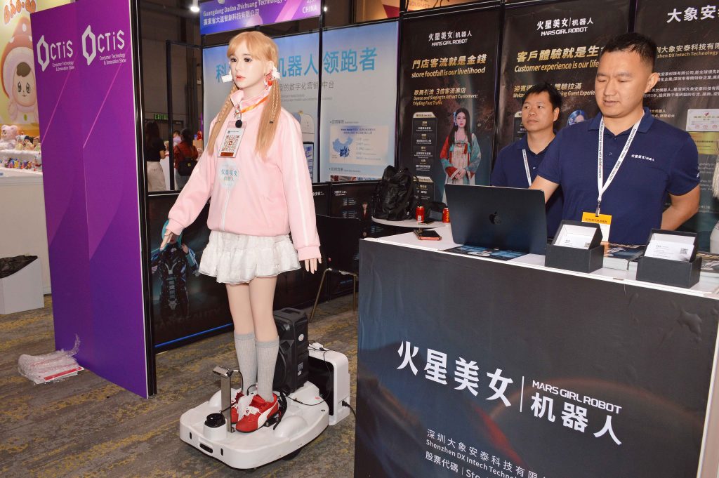 深圳大象安泰科技在眾擎攤位旁邊,擺放兩部「火星美女機器人」,歷時5年投資數千萬研製。機械人身高1.75米,臉部及手腕以矽膠製造,兩手自由左右揮動;雙眼設有鏡頭可供轉動,支援人臉追蹤、情緒及性別識別,能夠跳舞、唱歌、聊天及互動,可以擔當迎賓、導覽及諮詢等角色,以歌舞吸引客流進店。