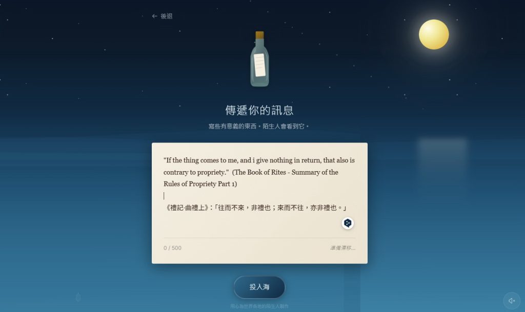 經本報實測,網民必須逐字輸入,無法使用複製貼上功能,而且只能純文字討論,不能附上任何圖片。按鍵「Cast into the Sea」後,隨即收到陌生人字條,例如「你克服了這麼多困難才走到今天,我為你感到驕傲」,更會顯示發送時間、寄件者的地區(例如印度)及地理距離。