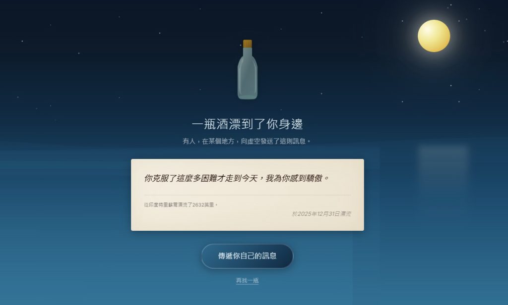 氛圍編程(Vibe Coding)技術流行,可一站式生成圖像及網站。社交論壇Reddit一個名為enigma_x的用戶,在大除夕請求人工智能(AI)編程工具Claude AI代為開發一款「讓人滿意」的應用程式,結果Claude AI開發出數碼漂流瓶服務DRIFT(https://adrift.today),可以匿名寫低想法(最多500字),再把它拋入虛擬海洋,越洋與陌生人傳遞訊息。