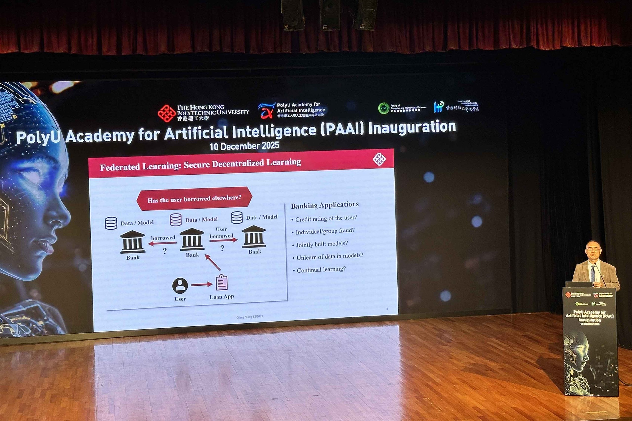 PAAI院長楊強在主題演講「AI革命:挑戰與機遇」中提到,團隊於過去幾年專注「聯邦學習」(Federated Learning)的研究,這屬於一種安全、去中心化的AI開發方式。他引述資料估計,AI開發最遲在2028年就會用盡所有公開資料;同時,大家對私隱與安全的擔憂日增,跨機構資料交換成為最大障礙。而聯邦學習正是讓模型「走訪」各個資料庫,但數據不出本地,只交換「知識」(加密後的參數)。