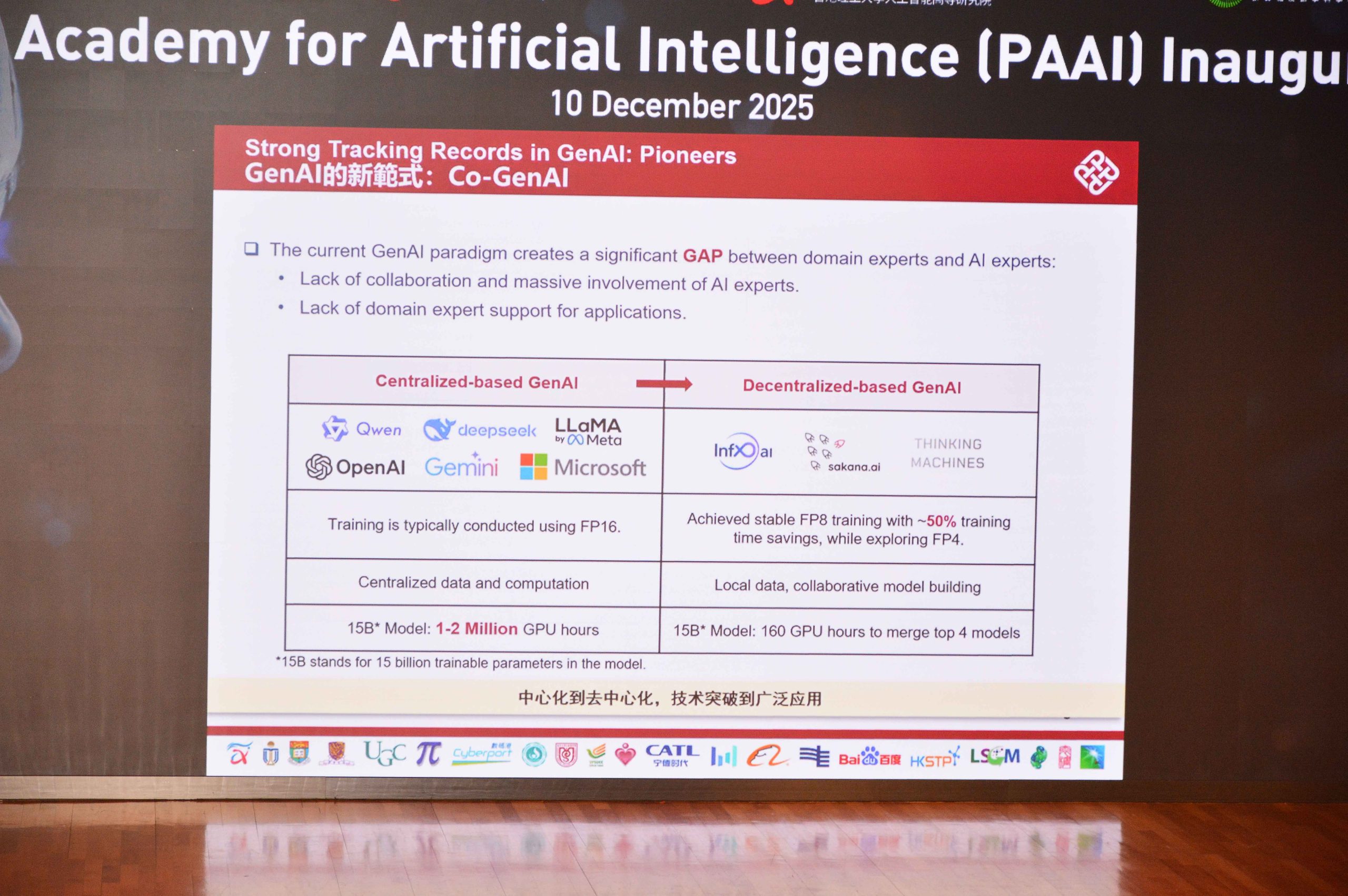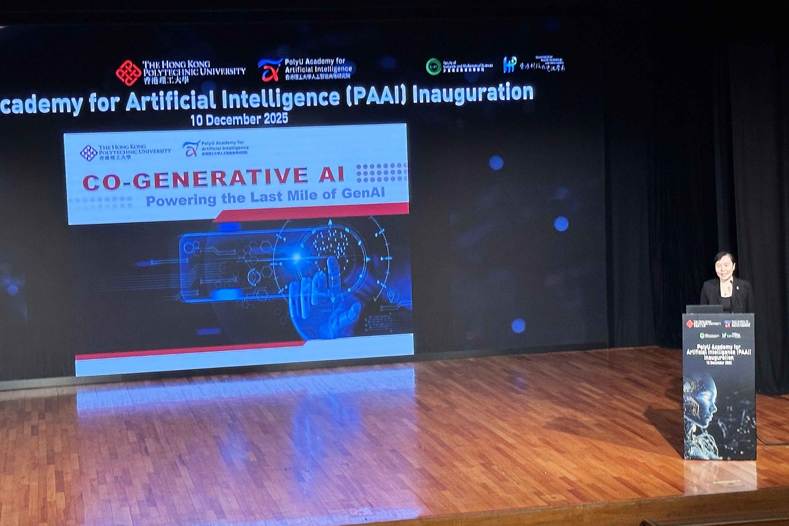 另一代表、PAAI執行院長楊紅霞,主題演講題目為「協作式生成AI」(Co-GenAI)。她提到,美國矽谷現時有一間前沿實驗室Thinking Machines Lab,同樣聚焦協作式生成AI研發,這20人初創成立僅兩個月,其估值已達150億美元(約1170億港元)。楊紅霞提到,去年7月加入理大前,在產業界待近15年,坦言「從2019年底就開始做生成式AI了」,那時她跟清華大學唐杰教授合作,曾幫助阿里巴巴(09988)及字節跳動,分別建立其基礎模型團隊。