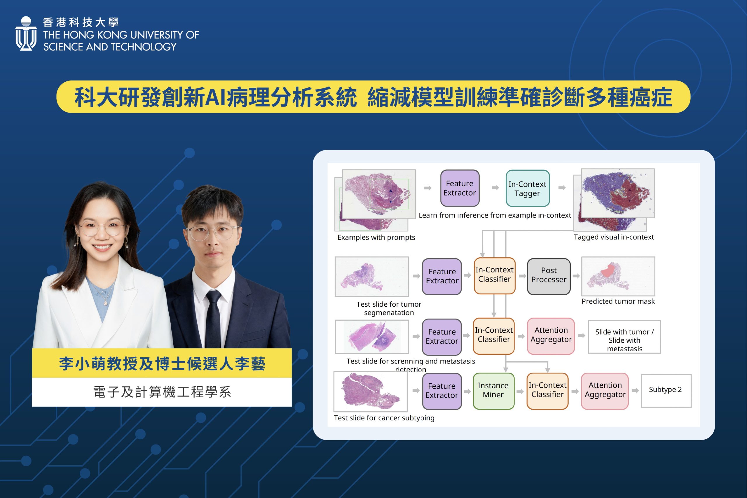 科大研究團隊聯同廣東省人民醫院及哈佛醫學院,開發一套全新病理分析系統PRET。系統首次引入自然語言處理的「上下文學習」概念,讓模型在推理階段僅需參考1至8張已標註的腫瘤切片,便可即時適配全新的癌症類型,並執行多項診斷任務,包括癌症篩檢、腫瘤分型、腫瘤分割等。研究團隊採用來自中國內地、美國、荷蘭等地區多所醫療機構,共23個國際基準數據集,涵蓋18種癌症類型及不同診斷任務,對PRET系統全面驗證。