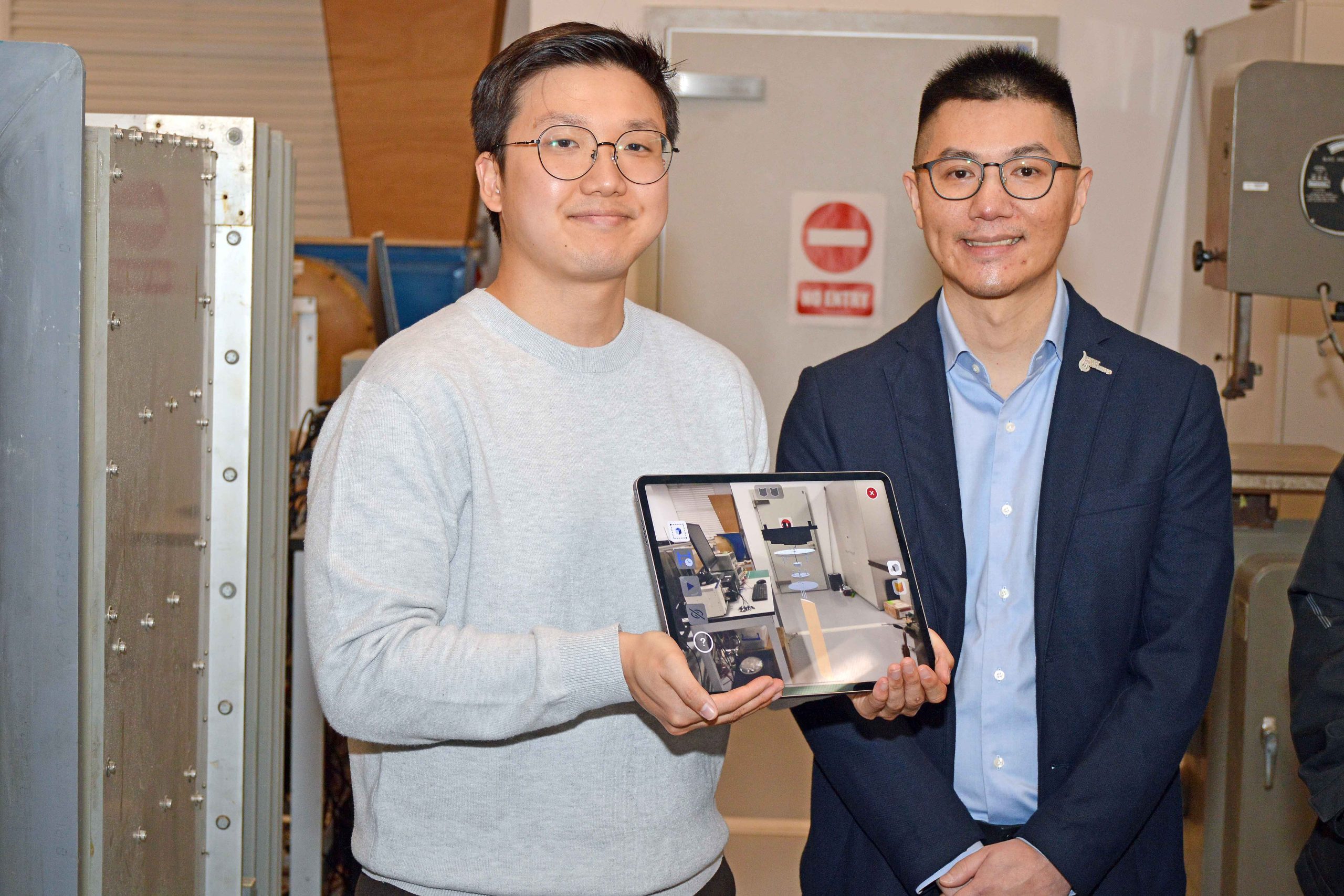 平台結合AI及AR技術,數碼重建科大的風洞實驗室,讓學生透過手機或平板預習;左起朴廷鎭、李建邦。(邱敏聰攝)
