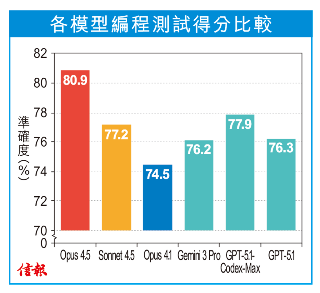 Anthropic聲稱,Claude Opus 4.5是至今最安全模型,抵禦提示注入式攻擊表現更佳;在編程基準測試SWE-Bench Verified,新模型是首個得分超過80%的版本,跑贏Google日前推出的Gemini 3 Pro(76.2%),以至OpenAI旗下GPT-5.1 Codex-Max(77.9%)、GPT-5.1(76.3%)等先進模型。
