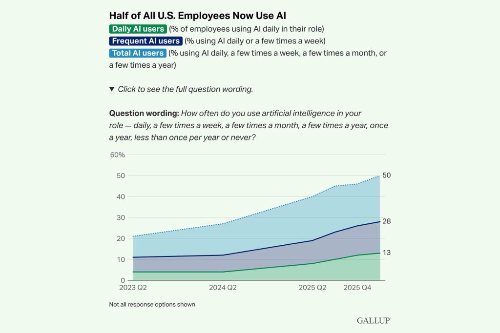 美國調查機構蓋洛普(Gallup)發表一項調查,指出人工智能(AI)雖正在改變職場,但仍屬漸進式而非革命性變革。報告發現,首次有半數美國成年就業者表示,他們每年至少會使用幾次AI技術,高於上一季的46%。AI的頻繁使用率也在上升,目前有13%員工每天都會使用AI,28%員工每周使用幾次或更多。