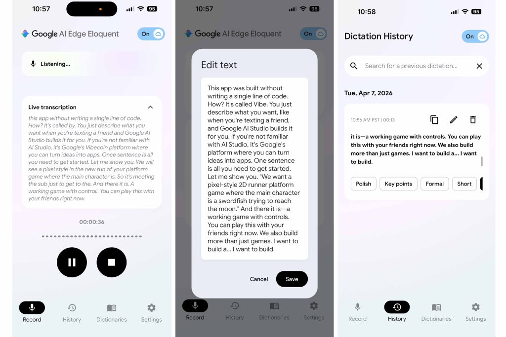 Google AI Edge Eloquent這款程式支援本地處理及雲端模式,下載基於Gemma的「自動語音辨識」(ASR)模型後,即可開始在手機上語音輸入。程式內會即時顯示轉錄結果,暫停後,應用程式會自動過濾語氣詞。