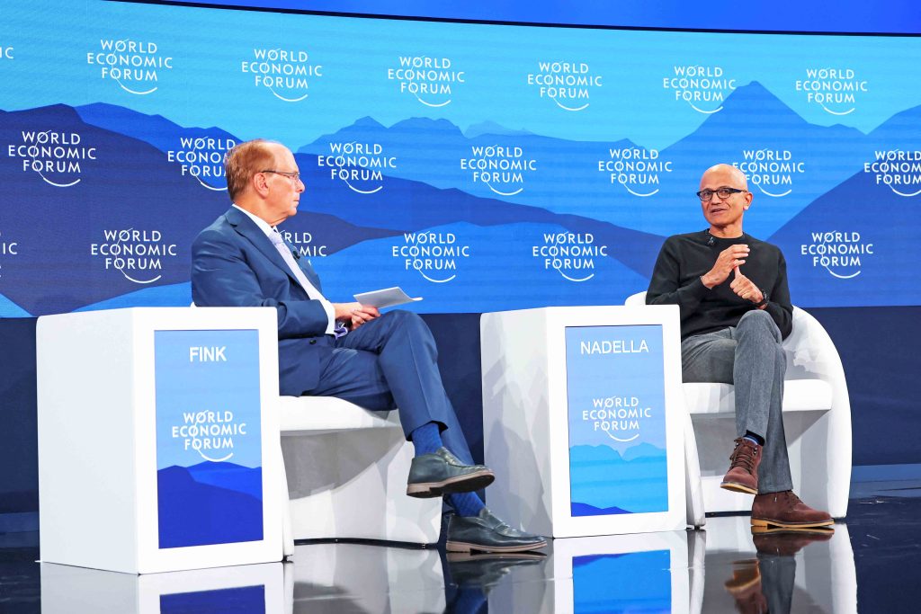 現場跟芬克對談的微軟(Microsoft)行政總裁納德拉(Satya Nadella),他將AI類比互聯網、流動裝置及雲端計算的影響,認為AI代表歷史性的「平台轉型」(Platform Shift)。AI從自動編程演進到自主代理,能夠全天候處理整個專案,目標並非取代人類,而是放大人類能力,例如加速藥物研發,或改善教育與醫療成果。他警告,若AI的成長僅僅源於投資,那可能就是泡沫的徵兆。