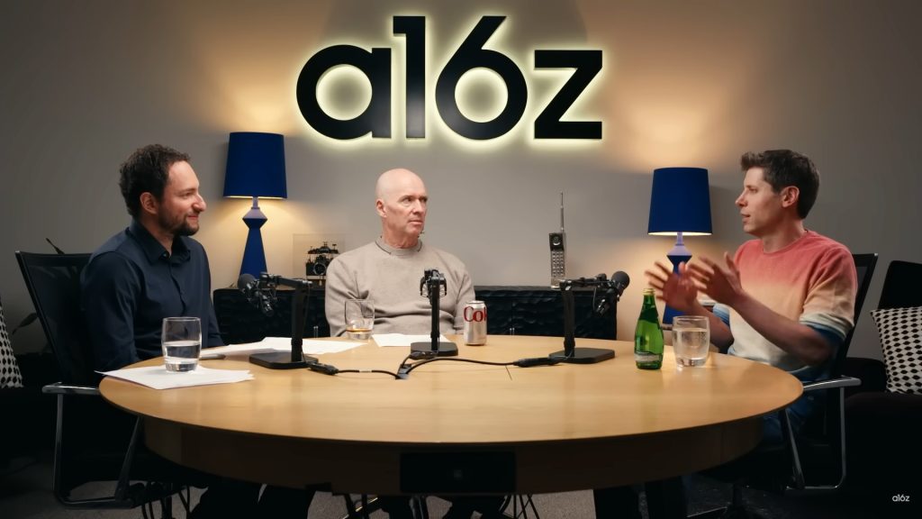 阿爾特曼(右)認為,為實現普及AGI使命,公司必須垂直整合發展;左起為a16z普通合夥人托倫伯格(Erik Torenberg)、a16z聯合創辦人霍洛維茨(Ben Horowitz)。(YouTube影片擷圖)