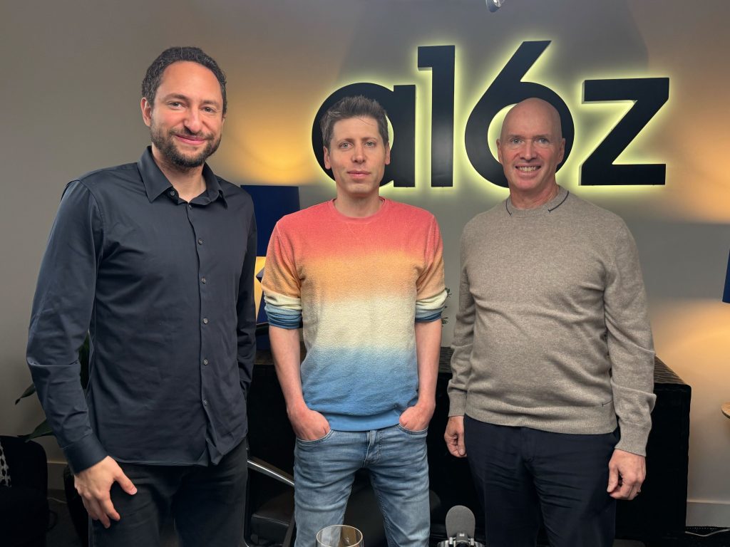 阿爾特曼(中)日前接受美國創投a16z專訪;左起為a16z普通合夥人托倫伯格(Erik Torenberg),右為a16z聯合創辦人霍洛維茨(Ben Horowitz)。(X網上圖片)