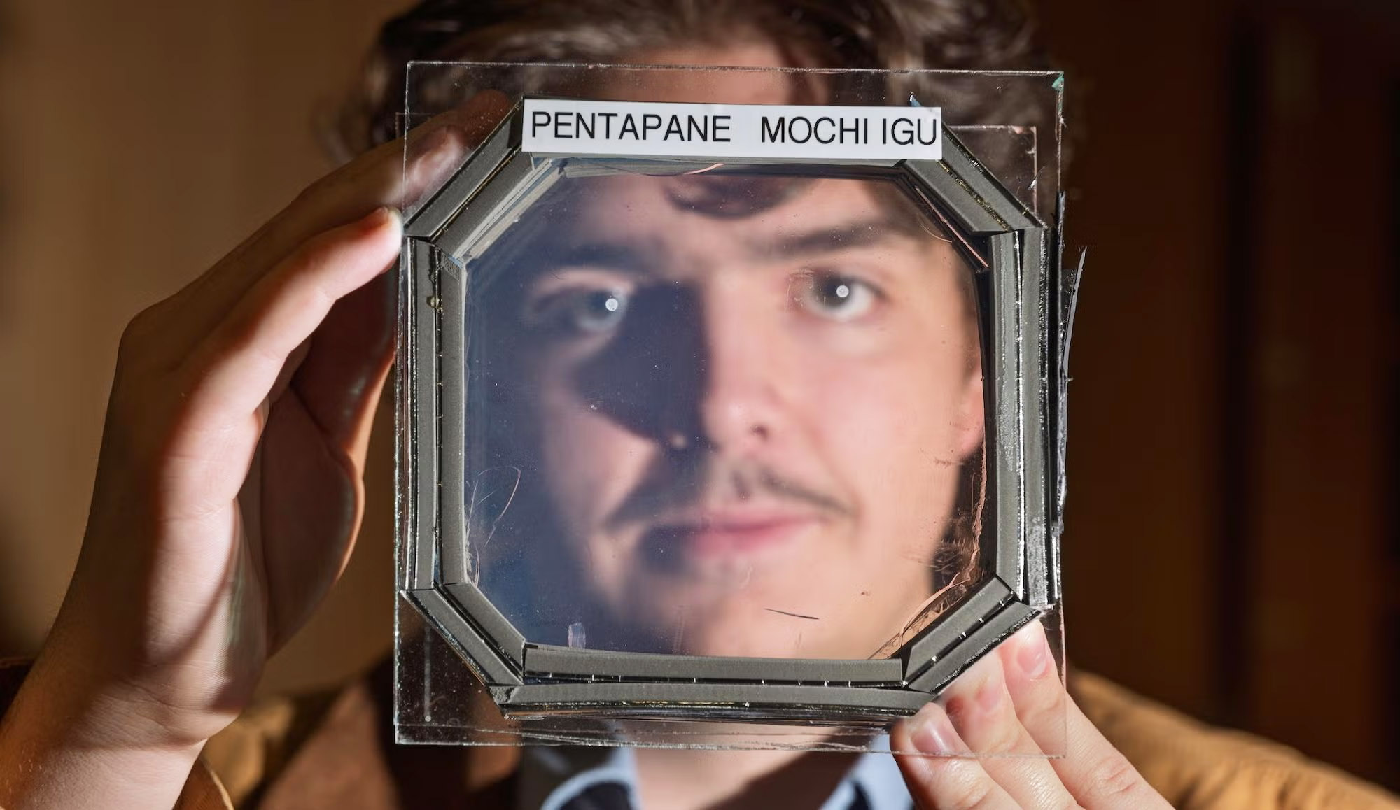 研究人員舉起一塊由五層MOCHI材料,以及兩塊玻璃組成的方塊。(CU Boulder Today網上圖片)