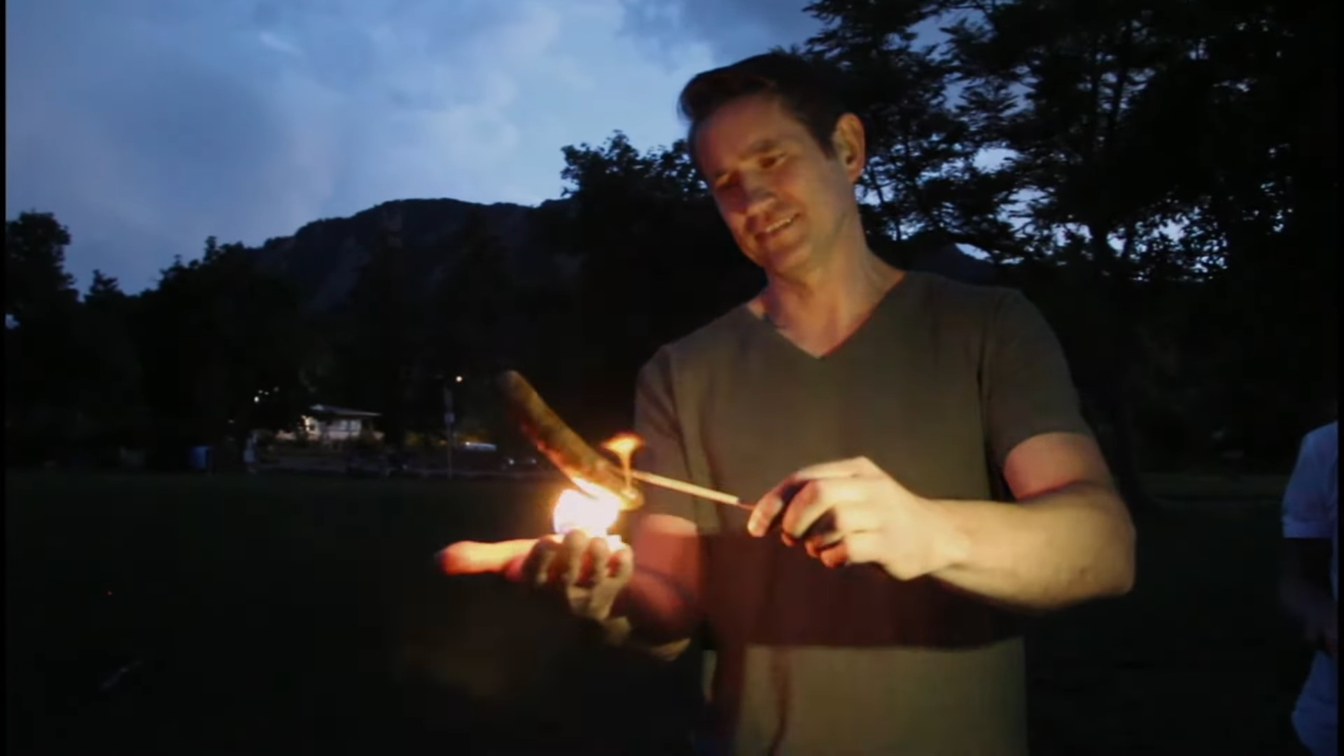 MOCHI薄片僅得5毫米厚,也能在手掌托住火焰,可淡定單手燒烤香腸。(YouTube影片擷圖)