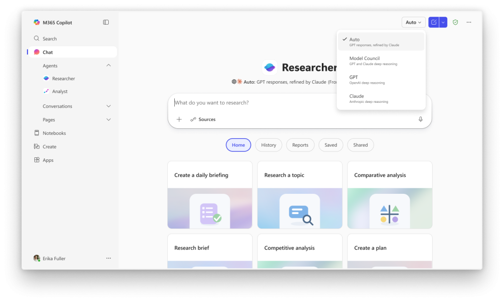 科技巨擘微軟(Microsoft)早前公布,更新旗下人工智能(AI)研究代理,新增Critique與Council兩項功能,讓研究人員可在單一工作流程內,同時運用Anthropic的Claude,以及OpenAI的ChatGPT這兩款不同模型。
