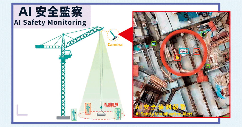 減少人手操作誤差,也是AI天秤另一優點。首先,系統結合激光與衞星定位技術,AI不但自動識別障礙物,一旦有人或物件距離天秤的吊鈎7米範圍時,AI天秤系統的智能駕駛艙,就會發出閃爍及警報風險警示;當工人進入吊鈎3米內時更會被標示,操作員可透過通訊系統警告工人。此外,工地設有穩定的網絡及訊號系統,並具備故障保險機制,在訊號異常或斷電時,能即時停止操作。