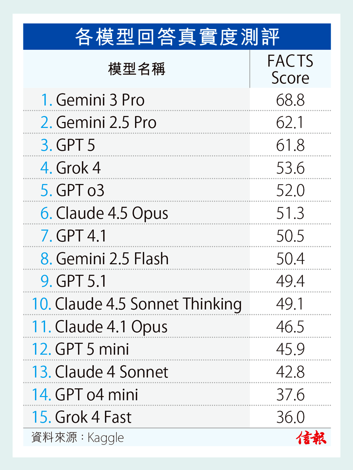 測試成績顯示。Gemini 3 Pro以69%的FACTS得分位居榜首,緊隨其後是Gemini 2.5 Pro及OpenAI GPT 5,得分約62%。Claude 4.5 Opus得分為51%,Grok 4得分接近54%。對需要精準數據的行業,例如金融、醫療保健、法律等,盲目信任聊天機械人將存在風險,不實資訊隨時釀成巨大損失。當AI模型成為可靠資訊來源之前,仍需驗證、監管及人類監督。