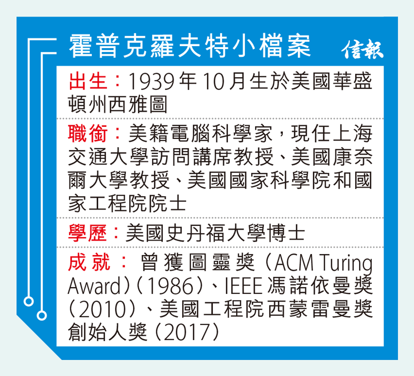 人工智能(AI)顛覆學習模式,不少年輕人致力裝備這項科技,視之為未來職場的敲門磚。然而,1986年圖靈獎得主、現年86歲的霍普克羅夫特(John Hopcroft)堅持,教育不在於傳授特定技術知識,真正有價值是軟技能,即是如何接近問題、與他人合作及有效溝通,這些能力才是職業生涯的基石。他鼓勵學生享受真正熱愛事物,別浪費人生。