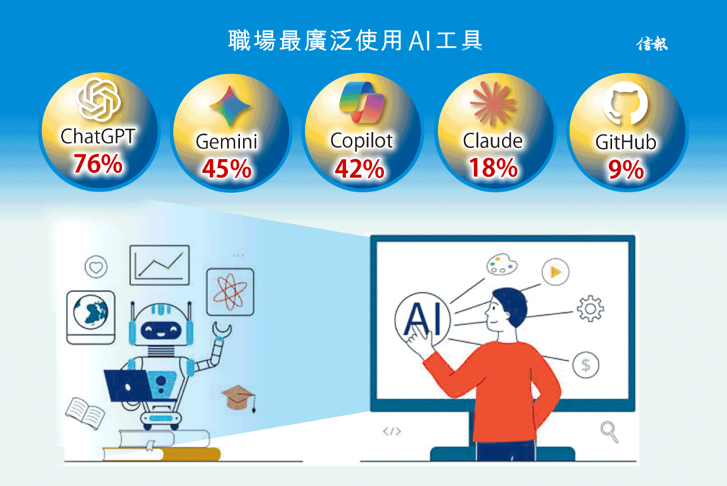 ChatGPT是職場應用最廣泛的AI工具,76%用戶將之用於各種任務,其次為Google Gemini(45%)及Microsoft Copilot(42%)。ChatGPT也是董事及管理人員(70%)、中階員工(80%)、入門級員工(62%)首選的AI工具。與此同時,銷售(50%)、數據分析(48%)、工程(46%)部門,在日常工作率先採用AI。