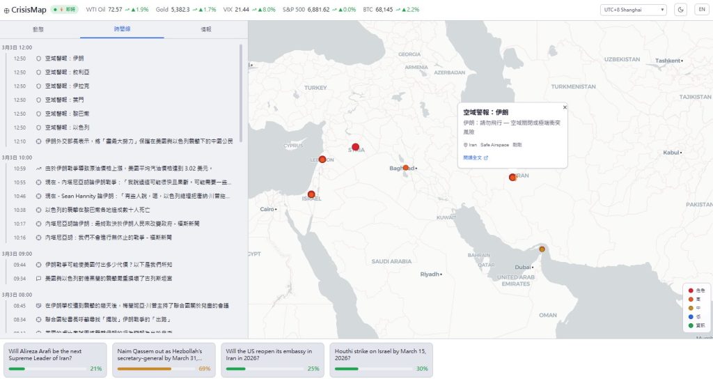 開發人員RealWayneSun上周六開源「即時地緣政治情報看板」(crisismap.vercel.app/zh-TW),專注追蹤全球地緣政治與軍事危機。在頁面頂部,顯示主要資產即時價格與漲跌幅,例如黃金、VIX恐慌指數、標普500及比特幣,列出多項熱門議題的市場及社群預測機率。