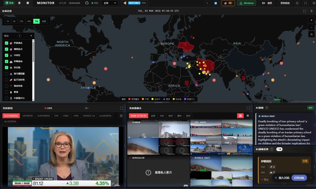 以「五角大樓披薩指數」為主題的Polyglobe(www.pizzint.watch/polyglobe),顯示數百個活躍Polymarket預測市場,把「錢在哪裏下注」直接畫到3D地球上。此外,World Monitor(worldmonitor.app)則顯示全球地圖,介面底部顯示多個電視台直播頻道,同時整合實時鏡頭、AI洞察及AI戰略態勢,協助用戶一站掌握市場消息。