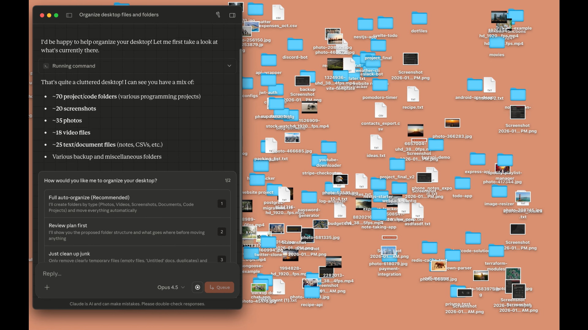 從示範影片可見,用戶可要求Claude Cowork自動整理Mac機的桌面檔案。AI會自動清點檔案類型,分類後再放入5個資料夾,每個以單獨名稱識別。不過,Cowork並非完全沒有風險,在「採取任何重大操作之前」,必須徵求用戶確認。除了容易受提示注入攻擊,用戶發出含糊不清的指令,亦可能導致災難後果,例如AI錯手刪除本機文件。