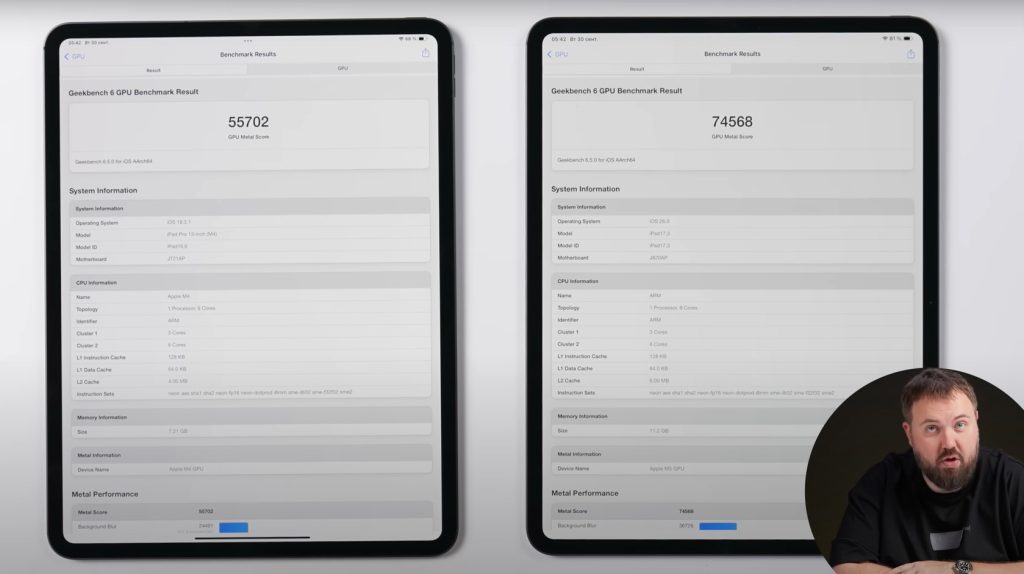儘管蘋果公司做足保密工夫,但一直有YouTuber能從其他不明渠道,取得未公開的產品開箱介紹。新主角是即將秋季發布的iPad Pro,它搭載Apple M5處理器(CPU)、12GB記憶體及256GB儲存空間。這款平板作業系統為iPadOS 26,電池生產日期為今年8月。在Geekbench 6多核心CPU測試中,晶片效能比M4 iPad Pro改善12%,圖形效能提升高達36%。