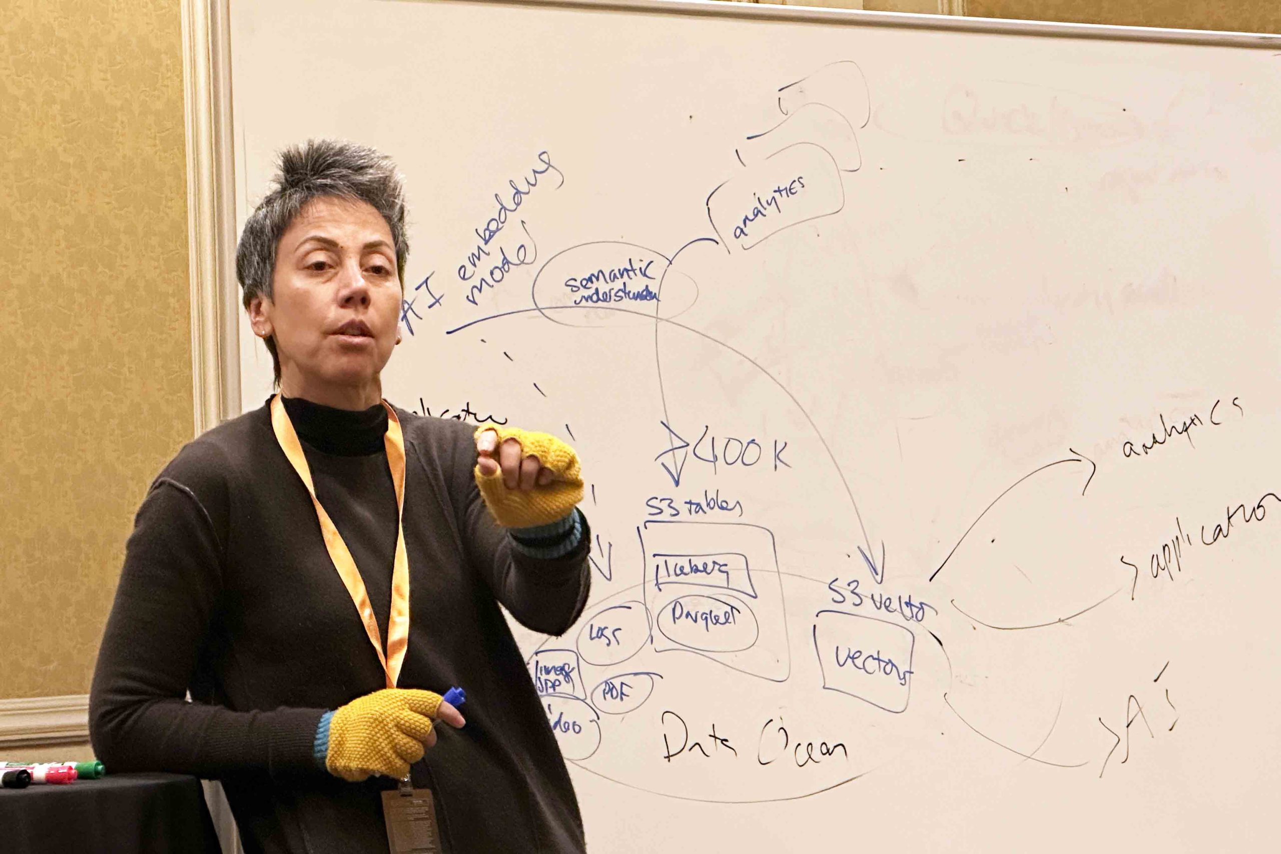 現時居於北京的布科維奇,是企業AI領域15位頂尖人物之一,並榮登AI 100及Cloudverse 100榜。她用筆在白板介紹,向量(Vector)是AI的通用語言,任何圖片、影片、文件、表格,都能透過「嵌入模型」轉成向量,捕捉真正的語意。過去由於成本高昂,企業只能向量化不到0.1%資料。如今S3 Vector把成本削減最高90%,讓「把全部資料向量化」變得經濟可行。