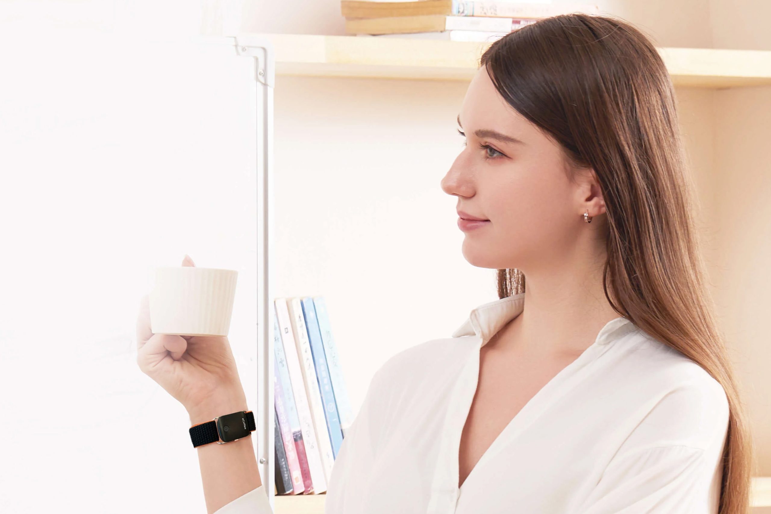 eCoffee外觀與普通手環相似,主機重量僅9.9克,工作電流處於微安到毫安級安全範圍。手環背面配備兩片電極片,發送溫和的電脈衝,以刺激正中神經(Median Nerve),訊號再透過中樞神經系統傳到大腦。下一步,透過增強腦血流量及神經傳導物質水平,以提高警覺性。這種電刺激能擴張血管,向大腦傳送更多血液及氧氣,有助提升專注力及反應速度。