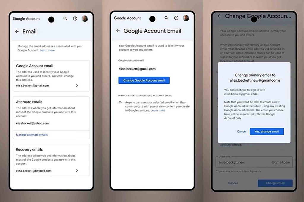 若要變更賬戶名稱,首先在Gmail流動應用程式,前往電郵設定頁面。然後,點選或輕觸「個人資訊」→「電子郵件」→「Google賬戶電子郵件」。若賬戶已啟用更改用戶名稱功能,將看到「變更Google賬戶電子郵件」選項,點擊後即可修改用戶名稱。要注意的是,用戶每12個月只能更改一次,期間也無法刪除現時電郵地址。
