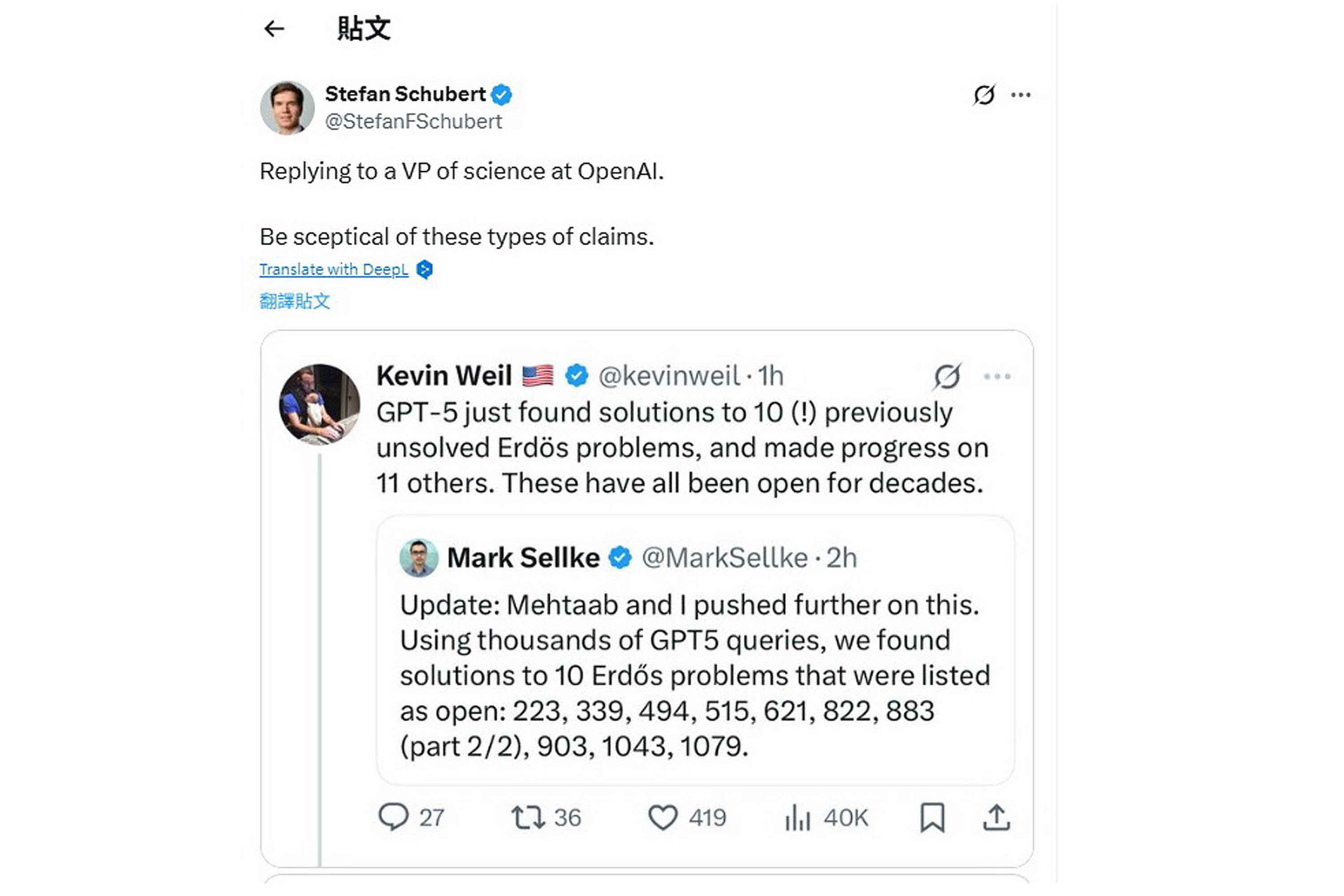 人工智能(AI)領域屢屢出現炒作,有時研發公司未經查核,便已發布誇張言論。例如OpenAI副總裁威爾(Kevin Weil)吹噓,公司聊天機械人取得重大數學突破:「GPT-5找到了10個(!)以前未解決的埃爾德什問題(Erdős Problems)的解決方案,並在其他11個問題上取得進展。」他卻在證明是假消息後,隨即刪除帖文。
