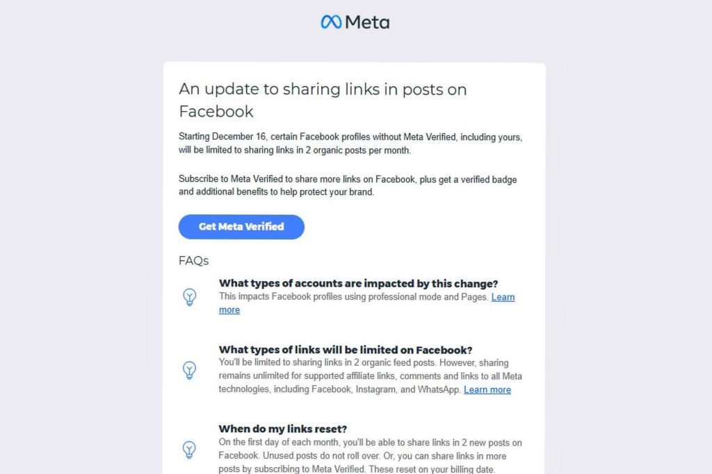許多創作者及企業宣傳都依賴Facebook(fb),若限制他們向外部網站引流,可能造成重大打擊。社群媒體顧問納瓦拉(Matt Navarra)指出,參與測試的用戶除非付費訂閱Meta Verified服務(月費14.99美元起),否則每月只能發布兩條連結。